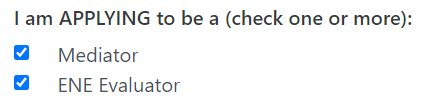 • IMPORTANT: Although the profile update describes "applying" to be a mediator or evaluator, we are not accepting applications at this time. Please DO NOT CHECK or UNCHECK the "Mediator" or "Evaluator" boxes. If you are not sure whether you are a member of a panel, please contact the ADR Program staff for assistance before proceeding.